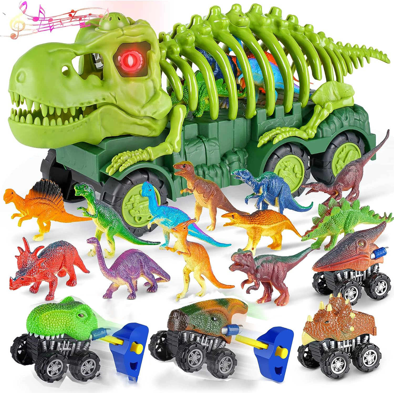 NAYAB Dinosaur Truck Toy for Kids, Dinosaur Skeleton Toys with Sounds and Lights, 12 Dinosaurs, 4 Mini Dino Cars, 50Pcs Dinosaurs Stickers Tyrannosaurus Rex Transport Gifts for Boys Girls
